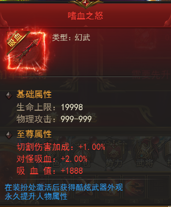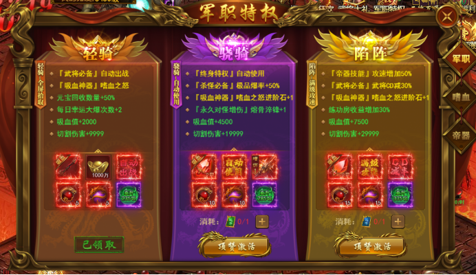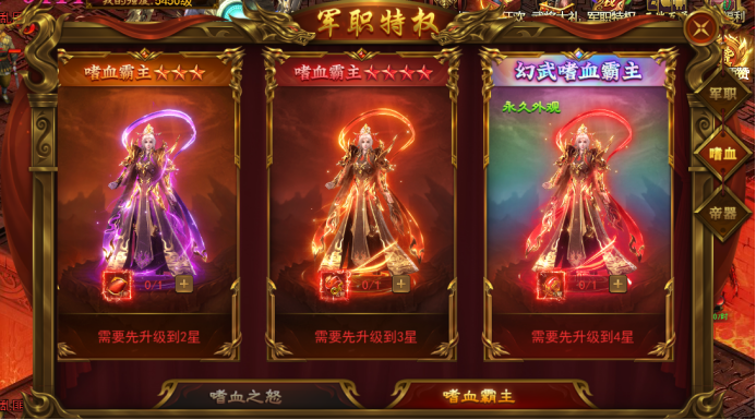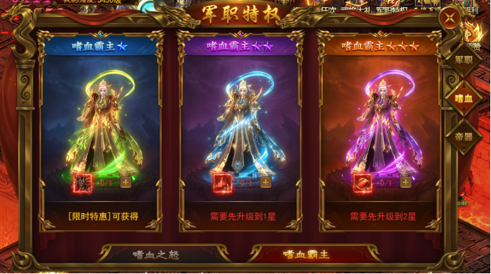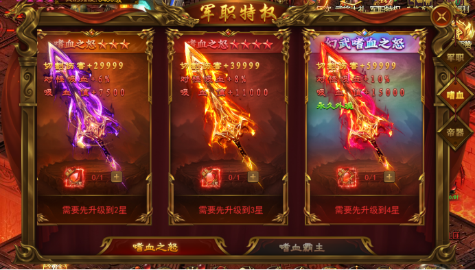 购买轻骑军职特权后,获取嗜血之怒。在装扮处理激活后获得炫酷武器外观,永久提升人物属性。其他军职特权获取嗜血升阶石,可以提升嗜血之怒星级,获得更强属性提升。