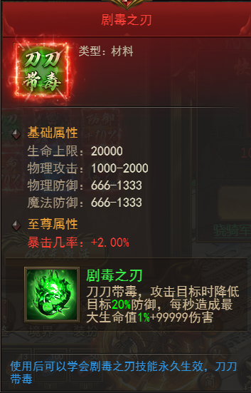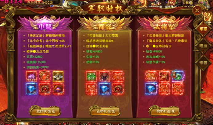 都尉特权获取紫冥弑魂葫,激活获取对boss首刀扣除10%最大生命值;都督特权可获得剧毒之刃激活后,可获取刀刀带毒属性;大将军特权获取绝对防御,被攻击时永远取zji最大的防御值,且免疫剧毒之刃效果。