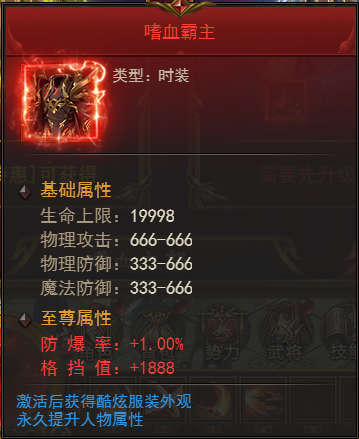 通过[限时特惠]可获得嗜血霸主,激活后获得炫酷服装外观,永久提升人物属性。使用霸主升星石,提升嗜血霸主星级。