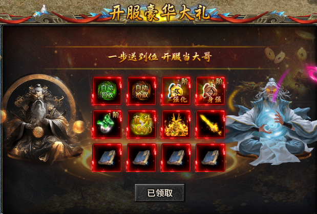 一步送到位,开服当大哥!自动回收特权、自动拾取特权、主印·强化、辅印、复活戒指、时装、武饰打包赠送,助你早日问鼎沙城!