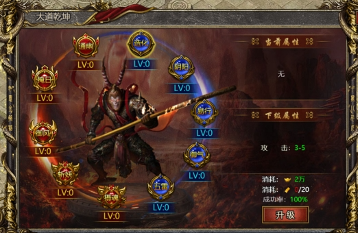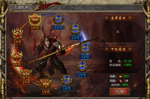 共有10个小系统组成,左侧为高级属性,右侧为初级属性,升级材料可通过打怪、击杀BOSS和回收高级装备获得,推荐获取~