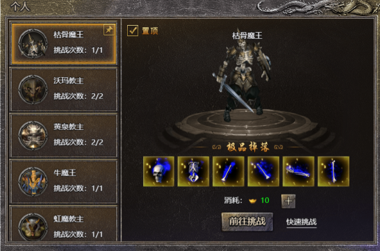2、可在首领挑战-个人处挑战枯骨怪物,获取魂骨装备和魂骨碎片