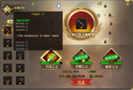 注灵可以激活灵魂套装属性,当十件装备达到相同等级即可激活物攻、物防和生命加成属性,激活的阶级越高,解锁的属性越高,最高为10阶。同样每件装备都可以注灵,每件装备可以注入三种灵魄,当着三种灵魄分别注满后会解锁装备下一阶